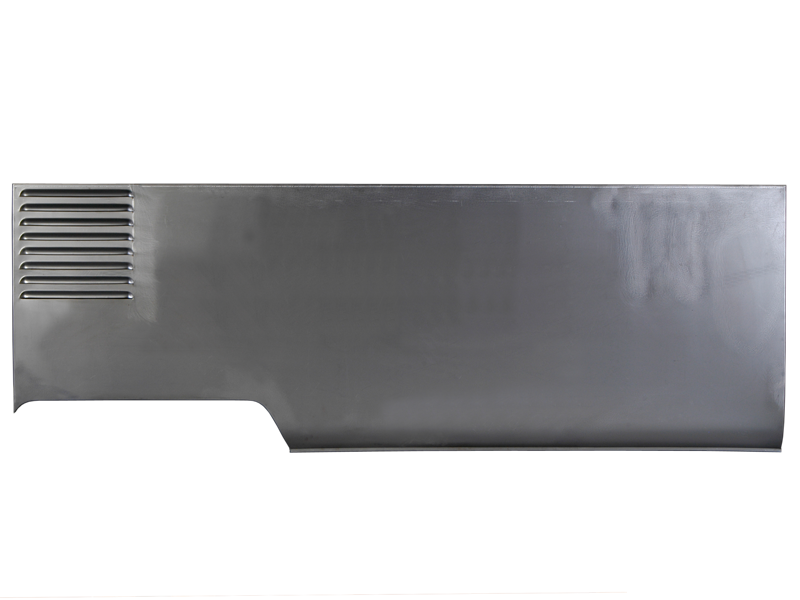 Complete long, right hand side panel for 1950 to 1955 Barndoor Splitscreen busses with cargo doors on the left hand side, normally right hand drive. The panel has 8 outward facing vents, flat wheel arch and no fuel flap opening. Correct up to March 1955, chassis number 20 117 901. Attaches at all factory join lines. Laser cut, part pressed and part hand formed from 1mm mild steel.