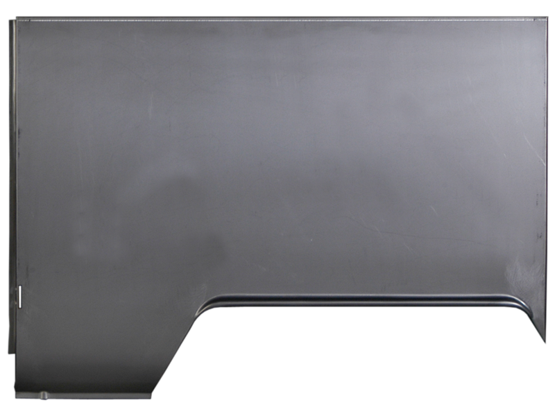 Complete short, left hand side panel for 1962 to 1967 model year Splitscreen busses with cargo doors on the left hand side, normally right hand drive. The panel has no vents, small lipped wheel arch and all holes and pressings for lower cargo door hinge. Correct from August 1962, chassis number 971 550. Attaches at all factory join lines. Laser cut, part pressed and part hand formed from 1mm mild steel.