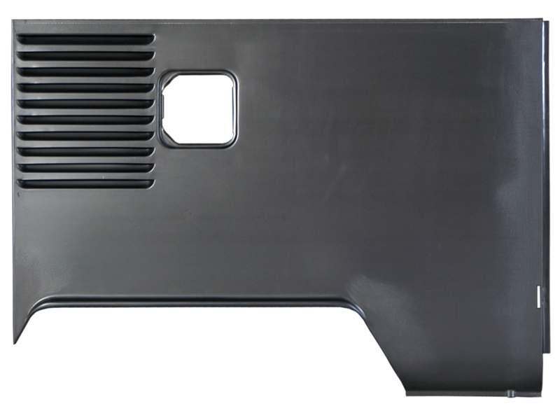 Complete, short, right hand side panel for late 1963 to 1966 model year Splitscreen busses with cargo doors on the right hand side, normally left hand drive and Double door busses. The panel has 10 inward facing vents, small lipped wheel arch, fuel flap hole for locking fuel flap and all holes and pressings for lower cargo door hinge. Correct from March 1963, chassis number 1 080 104 to August 1966, chassis number 2×6 198 668. (x can be any figure 1-8, denoting vehicle model type). Attaches at all factory join lines. Laser cut, part pressed and part hand formed from 1mm mild steel.